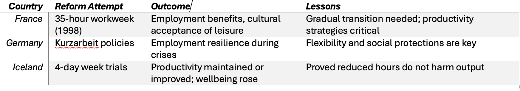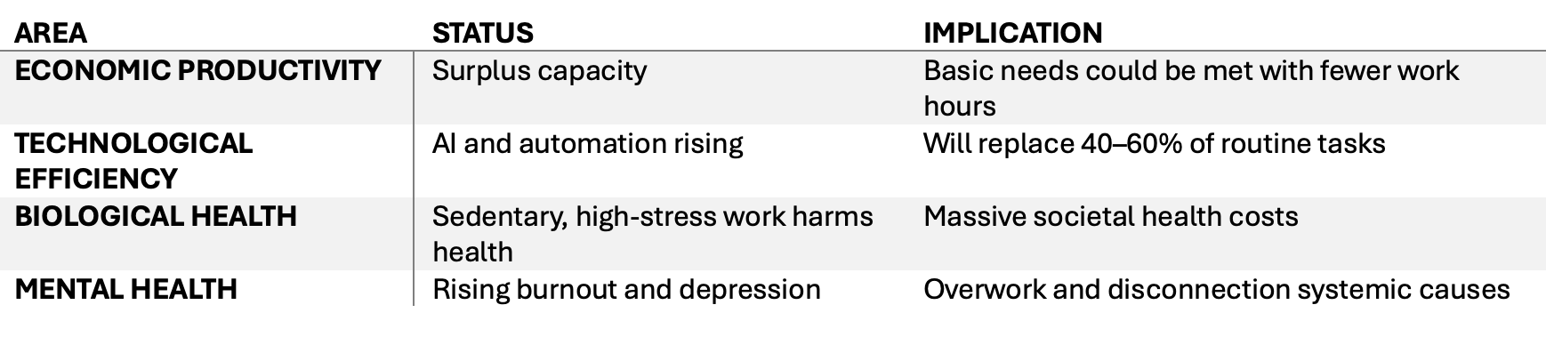 The modern 8-hour, 5-day workweek is increasingly biologically incompatible, economically unnecessary & inefficient, and socially harmful. Despite extraordinary productivity gains and emerging AI/automation capabilities, society clings to an industrial-era model influenced by an outdated Puritan work ethic and deliberate actions of entitled and rapacious elites. This article proposes a societal reset toward a healthier, more efficient, and more fulfilling balance between work, leisure, exercise, and reflection. It explores lessons from historical experiments, forecasts GDP and quality-of-life impacts, outlines global steps necessary for transformation.