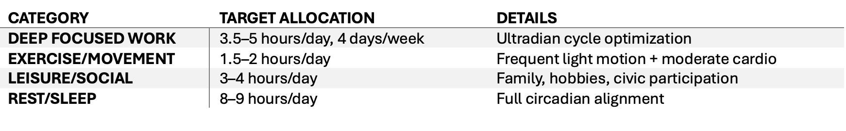 Based on human Ultradian [Ultradian refers to a biological rhythm that repeats more than once within a 24-hour day (i.e., shorter than a circadian rhythm)]. cycle research to maximize performance and well-being, human workdays should be structured around 90-minute work sessions with 15–30 minutes breaks, limiting total deep work to 3–4 cycles per day. This approach reflects the body’s natural rhythms and outperforms traditional 8-hour models in both efficiency and sustainability.