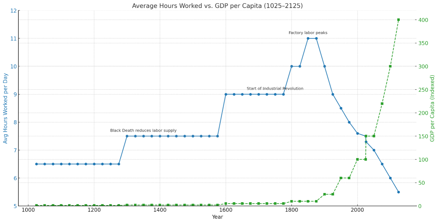 Religious leaders in medieval and early modern Europe taught that life on Earth was meant to be difficult as part of a divine test. Suffering was seen as spiritually purifying and rewarded with eternal happiness in heaven. This belief reinforced social hierarchies, provided hope in hopeless conditions, and promoted obedience and patience among peasants. Labor was framed as a moral duty and idleness as sin (17th-century Puritanism) [To be fair modern religions have largely shifted away from those roles and beliefs]. Early capitalists and elites leveraged and reinforced long work hours to maximize profits and control social behavior. The extent that industrialization reduced leisure is rather shocking: